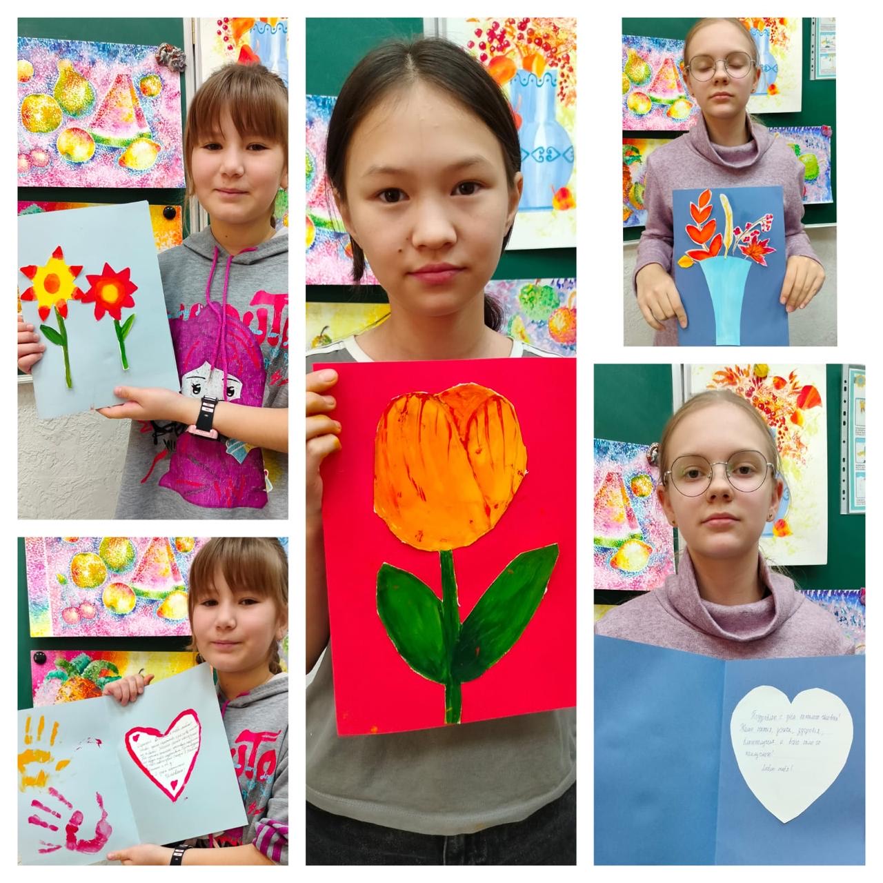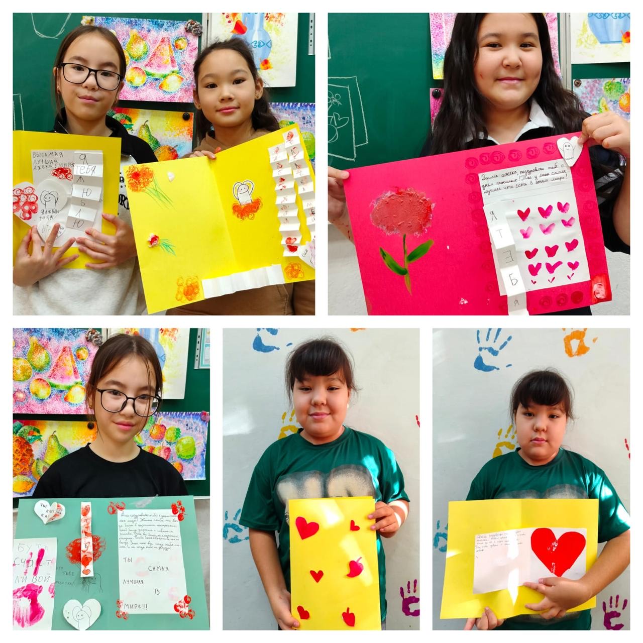 Біздің талантты оқушыларымыз оқытушымен бірге өз қолдарымен керемет ашық хаттар жасады. Әрқайсысы - шағын өнер туындысы: ашық түстер, нәзік суреттер және шынайы тілектер. Бұл ашық хаттар туған-туыстарыңызға және жақындарыңызға күлімсіреп: «Сіз - біздің шабытымыз!» деп еске салу үшін ұшып кетті